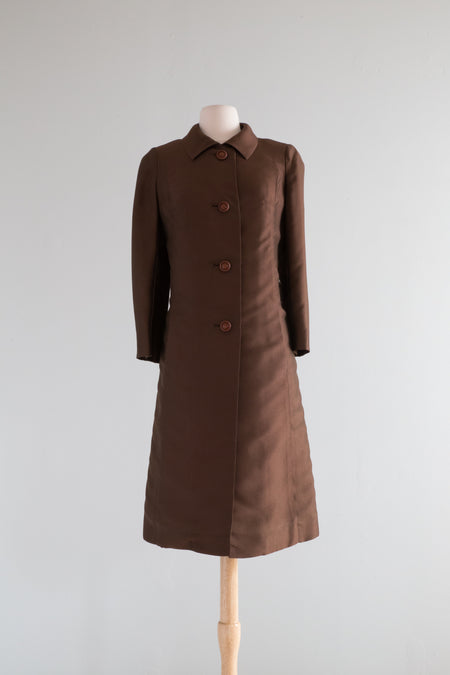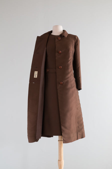 Elegant 1960's Chocolate Silk Two Piece Dress & Coat Set By Robert Leonard / ML