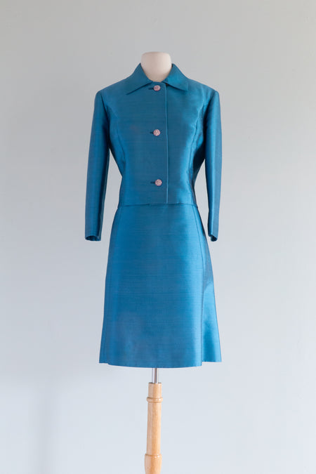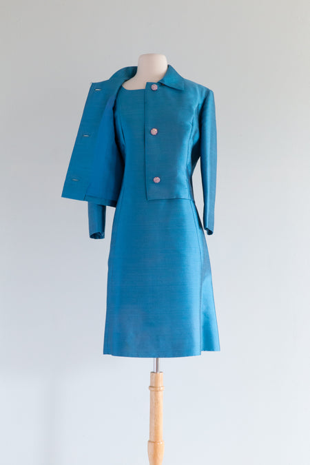 Gorgeous 1960's Cerulean Blue Silk Dress & Jacket Set / ML