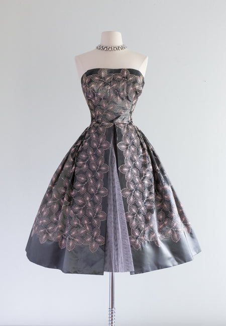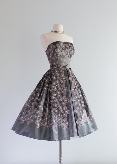 Exquisite 1950's Embroidered Leaves Silver Taffeta Party Dress / XS