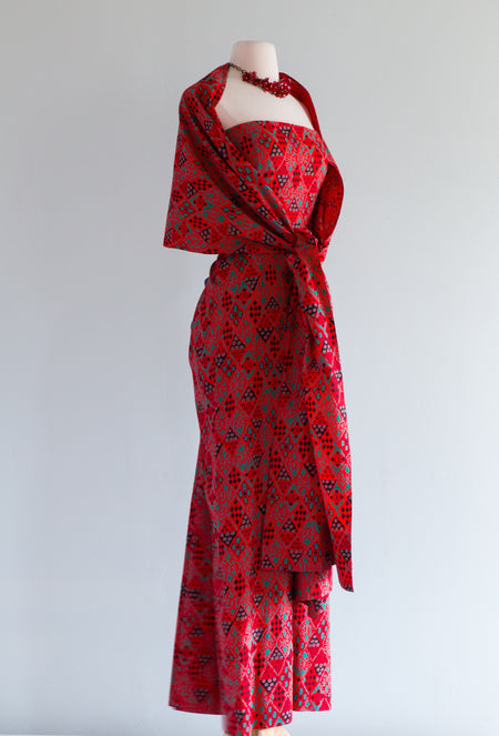 Glamorous 1940's Red & Green Cotton Gown And Wrap / Small