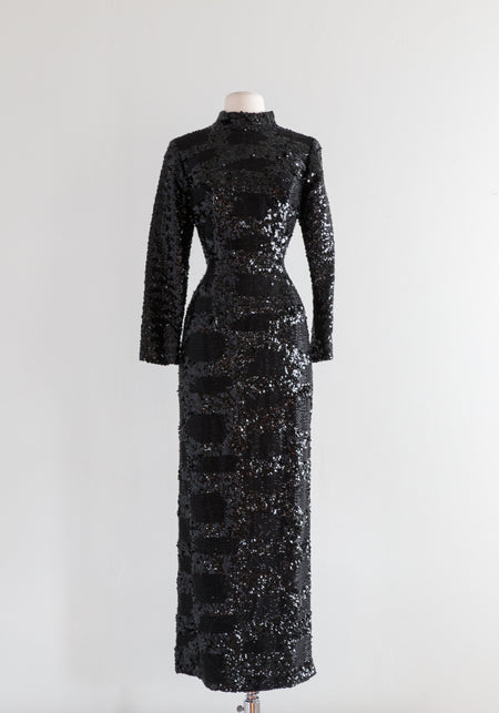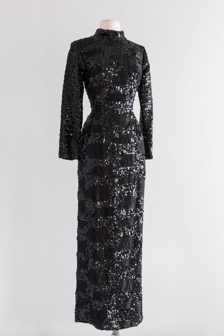 Sold Out Black 1930's Silk Velvet Beaded Bias Cut Gown With Scalloped Sleeves / Size Medium Large $348.00
