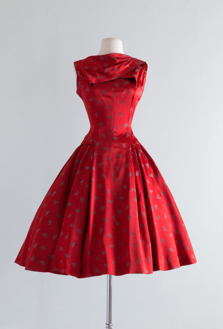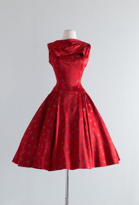 Sold Out 1950's Crimson Red Drop Waist Party Dress With Emerald Sprigs Of Mistletoe / Waist 28 $348.00