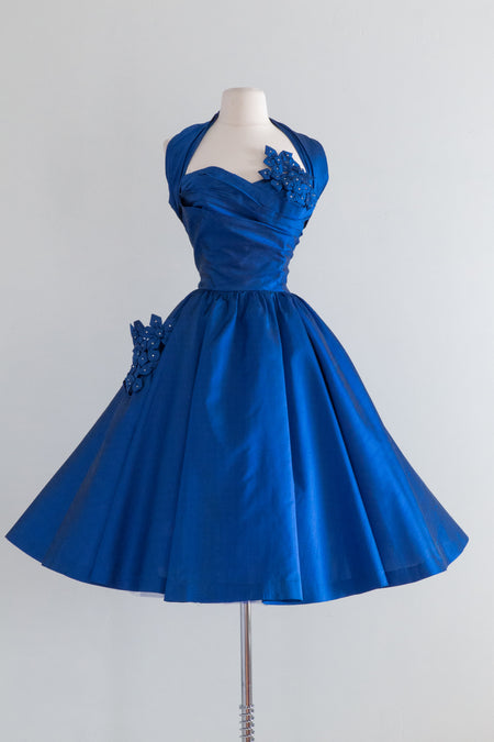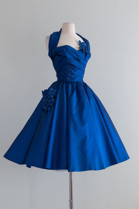 1950's Sapphire Blue Silk Party Dress With Rhinestones / Waist 27