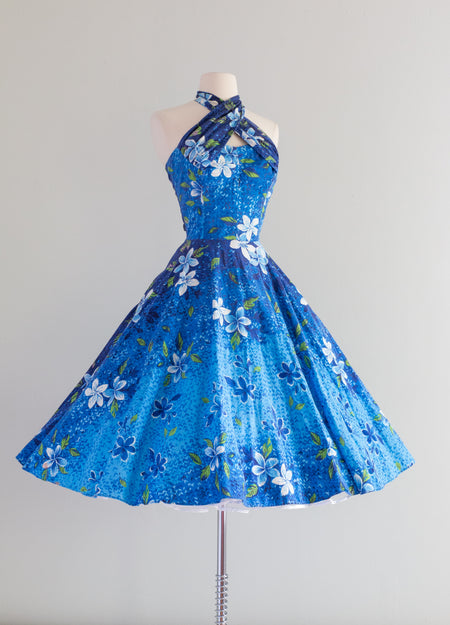 Sold Out Brilliant Blue 1950's Cotton Hawaiian Dress by Kamehameha With Full Skirt / Waist 28 $348.00