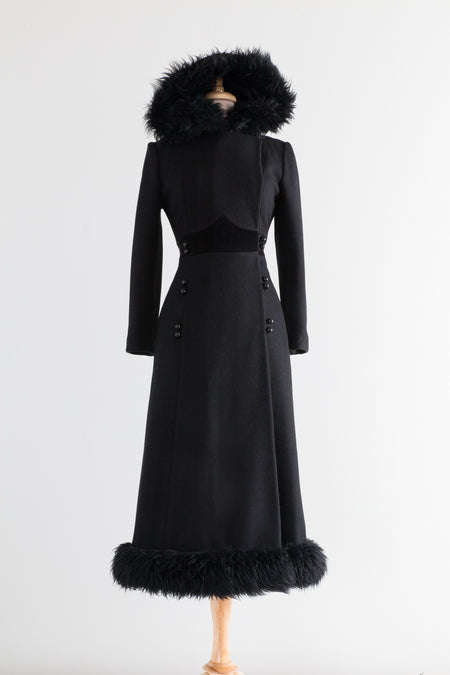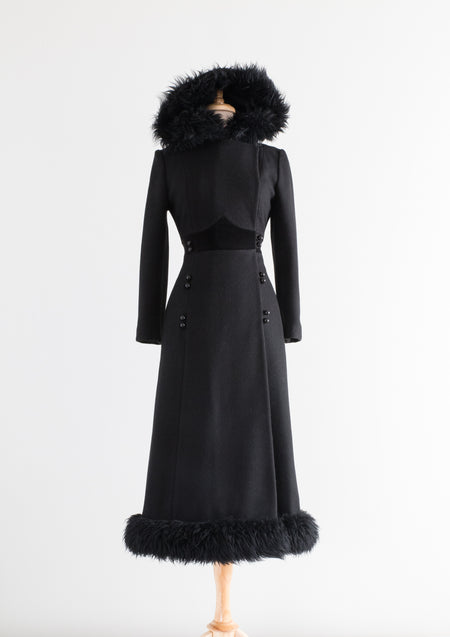 Dramatic 1970's Black Wool Maxi Coat With Hood / SM