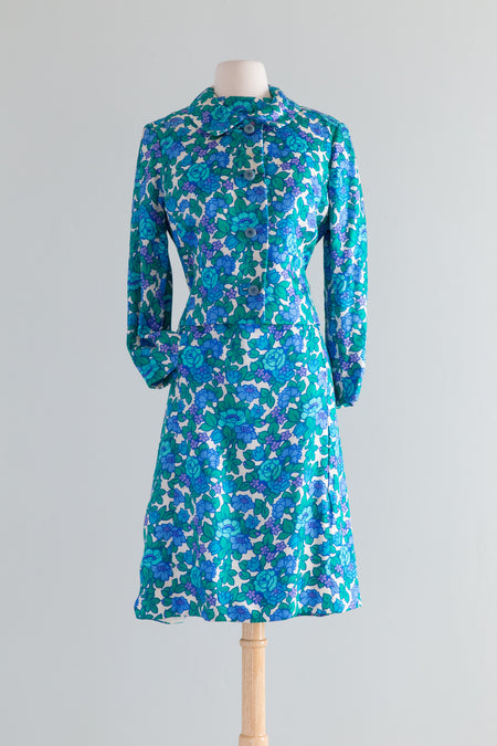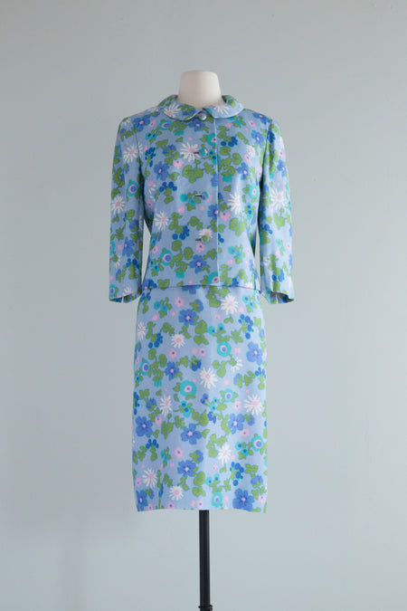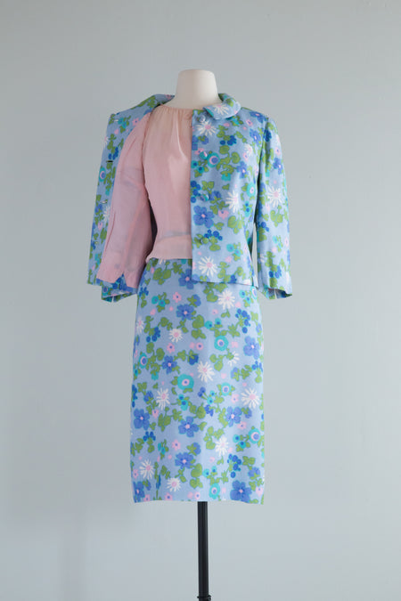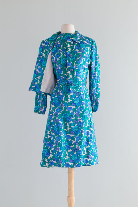 Fabulous 1960's Blue Floral Silk Dress & Jacket Set By Milton Saunders / ML