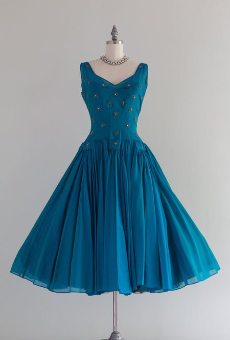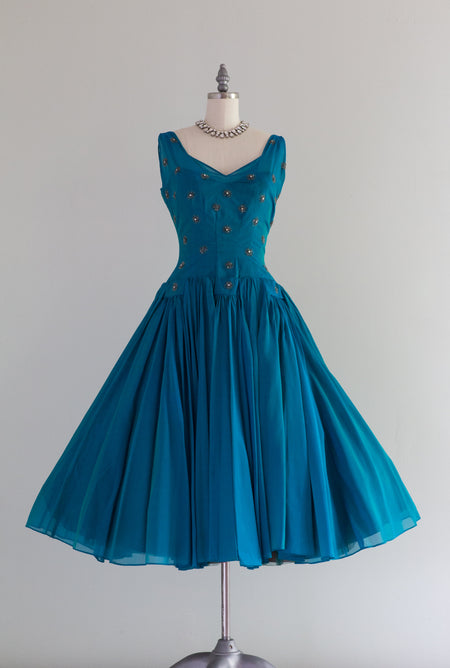 Fabulous 1950's Iridescent Teal Chiffon Cocktail Dress / Small