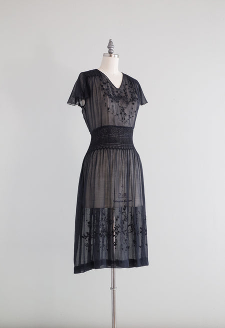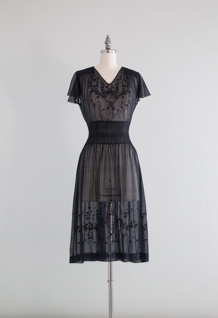 Beautiful 1920's Black Cotton Voile Hungarian Peasant Dress / Medium