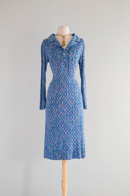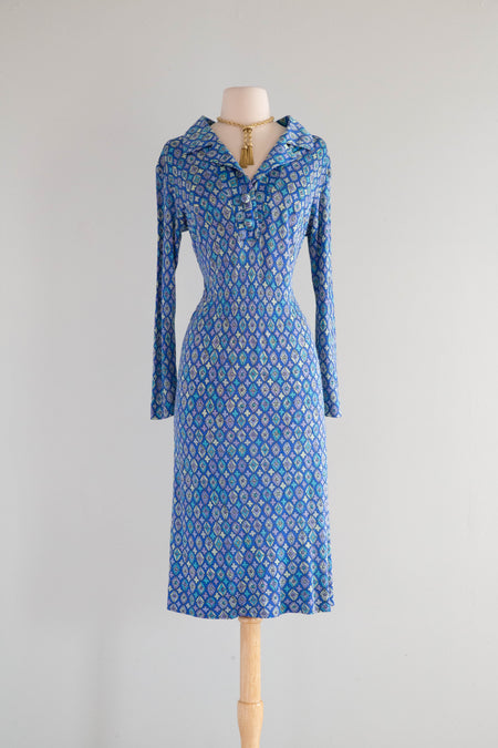 Sold Out Fabulous 1960's Emilio Pucci Silk Jersey Signature Print Dress With Collar & Long Sleeves / M $348.00