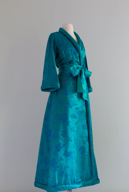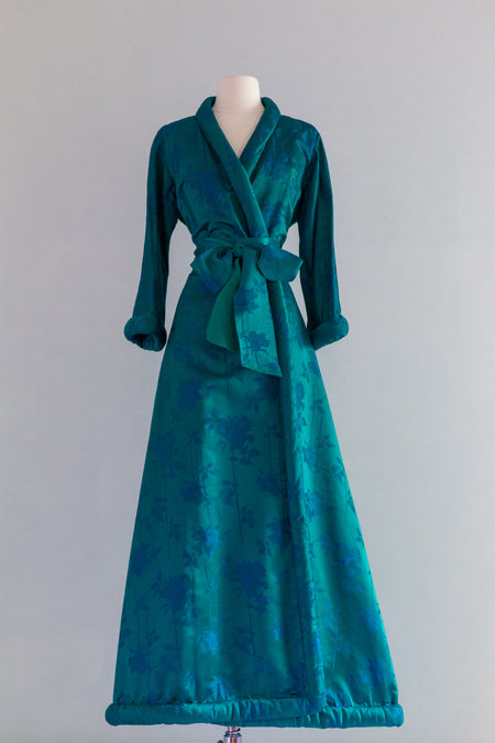 Deluxe 1950's Peacock Green Silk Brocade Dressing Gown By Dynasty / Medium