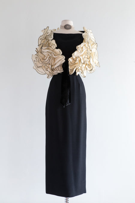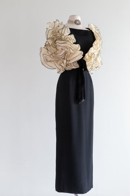 Fabulous 1960's Black Evening Gown With Organza Cloud Cape / Small