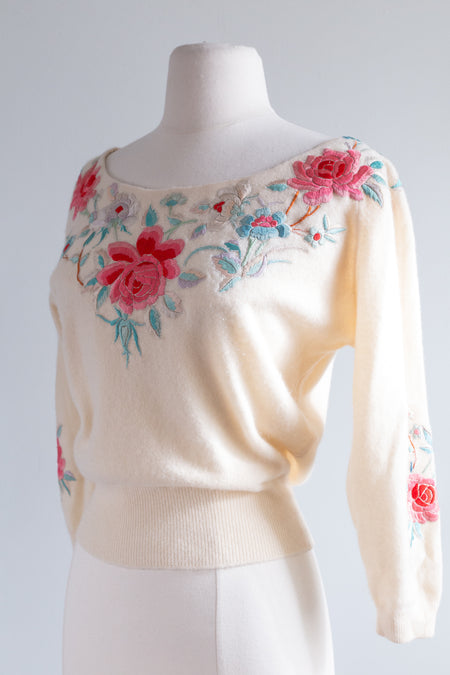 Sold Out Exquisite 1950's Hand Embroidered Cashmere Scoop Neck Sweater Bullocks Wilshire / Medium $398.00