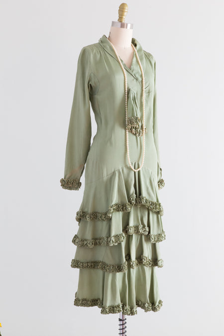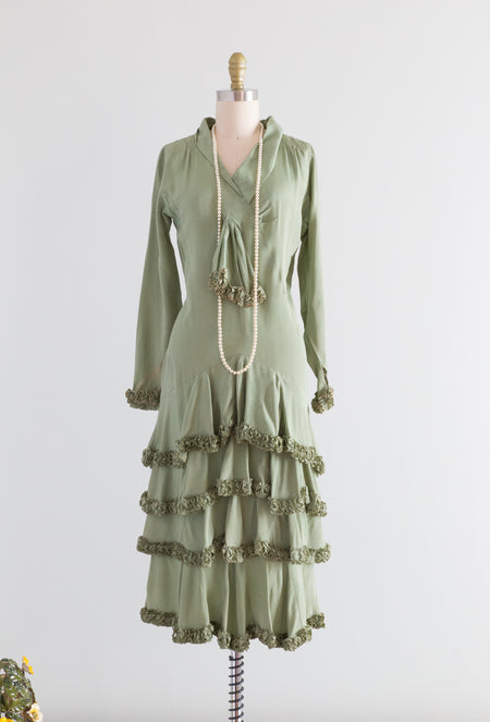 Darling 1920's Green Silk Flapper Day Dress With Ruffles / Small