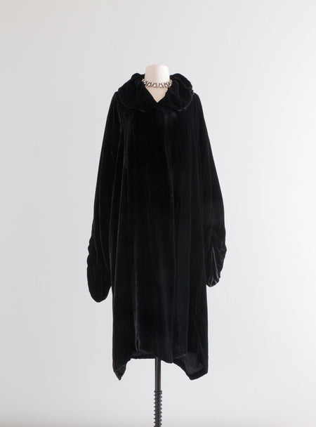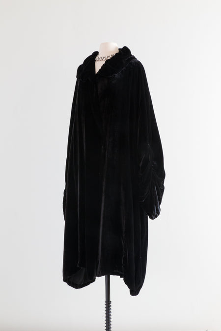 Sublime 1920's Black Silk Velvet Opera Coat With Massive Sleeves / OS