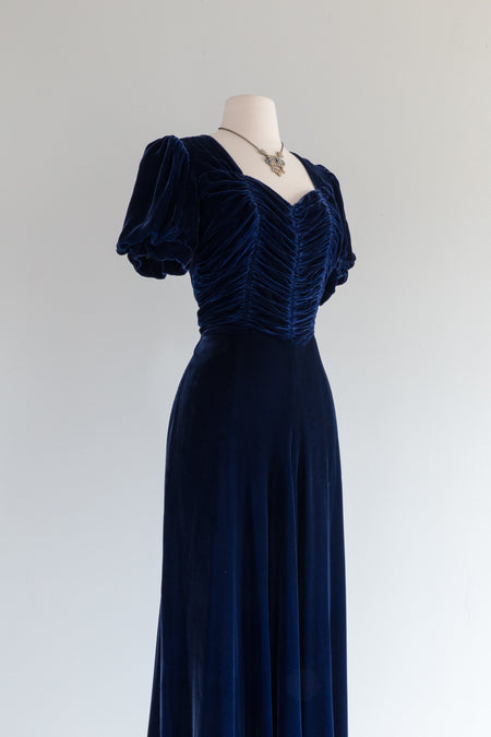 Elegant 1930's Blue Silk Velvet Evening Gown / ML