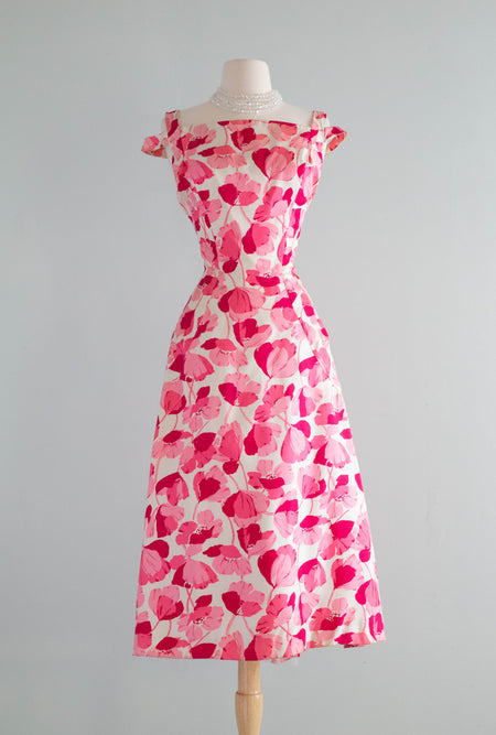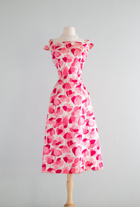 Glamorous 1950's Pink Poppy Print Cocktail Dress By Estevez / Medium
