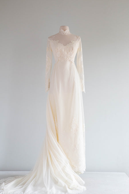 Enchanted 1970's Candlelight Ivory Romantic Wedding Gown With Floral Appliqués / M