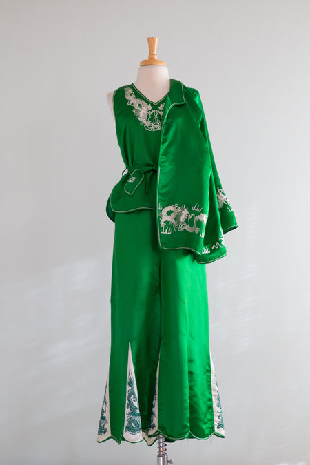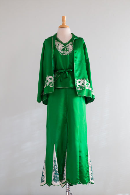 Fabulous 1930's Brilliant Green Silk Embroidered Chinese Loungewear Set / Small