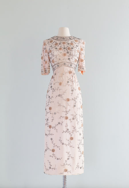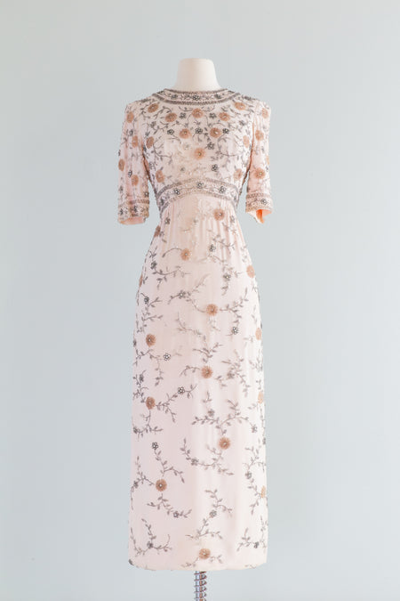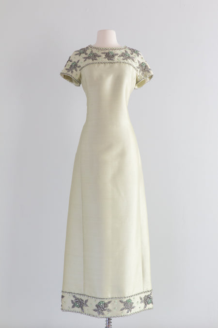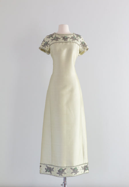 Sold Out Elegant 1960's Celadon Green Shantung Silk Beaded Evening Gown By Jean Lutece / Med. $448.00