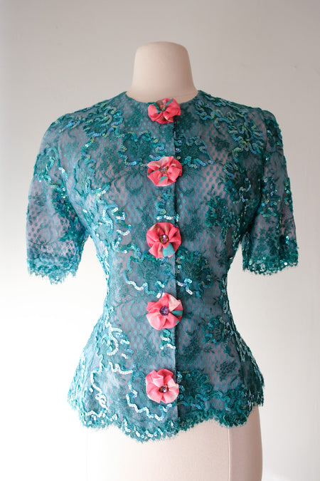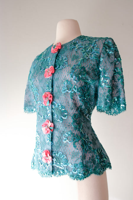 Dazzling 1980's Teal & Fuchsia Lace Sequin Top / Sz L