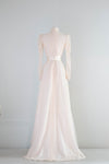 This exquisite wedding gown captures the romantic elegance of the 1970s with Edwardian-inspired details. Crafted in ivory blush, it features a fitted waist that flatters your figure, sheer puffed sleeves delicately trimmed with lace, and intricate lace patterns throughout. The full-length skirt flows gracefully, while buttons up the back add timeless charm. Fully lined for comfort, it includes a matching sash to accentuate your silhouette, making it the perfect dress for your unforgettable day. In excellent condition, freshly dry cleaned and ready to wear.