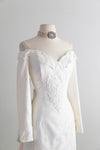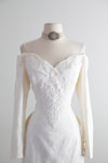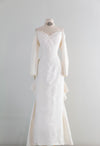 This exquisite 1980's Jessica McClintock wedding gown features an off-the-shoulder neckline and luxurious ivory brocade fabric. Delicately trimmed with Venetian lace and enhanced by subtle sequin embellishments, it offers a fitted hourglass silhouette that flatters the figure. The pleated train, adorned with a bow and rosettes at the back, adds a dramatic, fairytale touch. In excellent condition, this romantic wedding gown embodies timeless elegance for a truly unforgettable bridal look. In excellent condition, freshly dry cleaned and ready to wear.