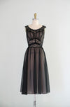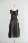 Lovely 1950's black lace night dress by Vanity Fair. Black and pink nude layered nylon with black lace details and satin ribbon ties and the waist. Sleeveless night dress, semi sheer. No zips or claps. Freshly cleaned and ready to wear!