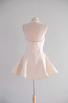 This early 1990s ivory halter mini showcases the refined aesthetic of Barbaglio, the design venture of sisters Cristina and Jan. Rooted in their Mexican heritage and rural upbringing, the designers merged contemporary 90s proportions with the refined detailing of traditional Mexican bridal wear. The dress features a structured figure skater silhouette enhanced by horizontal pin-tuck pleating that creates dimensional texture throughout. Practical construction includes a halter neckline secured with buttons behind the neck and a zipper for ease of wear, complemented by a full, voluminous skirt. Professionally cleaned and ready to wear, this piece represents an intersection of southwestern cultural design influence and 90s style.