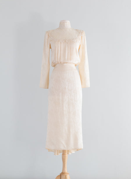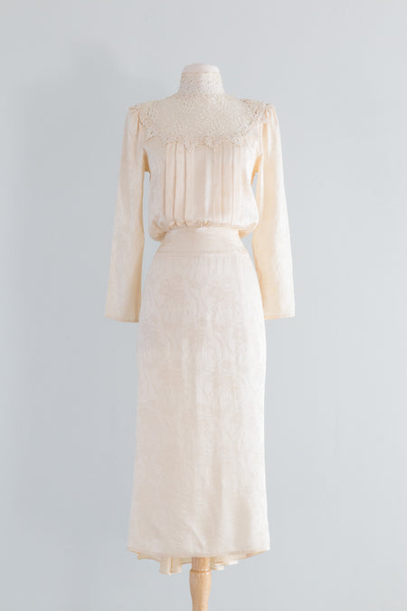 1940's Floral Flocked Slipper Satin Princess Wedding Gown / Medium