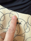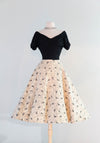 I have never seen anything quite like it! Classic 1950's cocktail party dress by Claudia Young featuring a sexy draped bodice with open neckline, short sleeves and a full ivory felt circle skirt. The felt features dancing ladies among swirls and studded rhinestones. Side pockets complete the look. Zips up the side with original metal zipper. In very good condition, freshly dry cleaned and ready to wear.