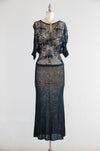 An exquisite example of 1930s craftsmanship, this hand-crocheted dress embodies the romantic artistry of the era. Fashioned in a deep forest green thread, it features an intricate openwork bodice of floral medallions and lattice motifs that sculpt gracefully to the figure. The half-length sleeves fall in soft, scalloped edges, echoing the femininity and ease of the period’s handwork. The skirt transitions to a tighter, more linear crochet pattern, creating a striking play of texture and light that elongates the silhouette. Designed to skim the body before gently flaring at the hem, it moves with a fluid elegance characteristic of late-Depression-era eveningwear.