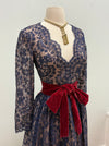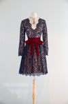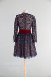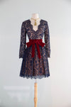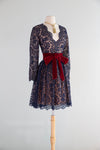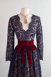 Stunning 1960's Saks Fifth Ave. Blue Lace Cocktail Dress With Crimson Velvet Sash / M