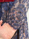 A breathtaking example of 1960s evening elegance, this cocktail dress from Saks Fifth Avenue epitomizes the era’s romantic allure. Crafted from navy blue floral lace over a nude-toned underlayer, it creates an enchanting play of shadow and light—revealing just enough while maintaining refined sophistication.