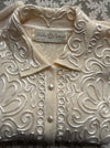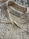 An exquisite example of mid-century luxury knitwear, this 1950s cream cashmere cardigan by Hadley Cashmere epitomizes the era’s devotion to refinement and meticulous craftsmanship. Fashioned of 100% pure cashmere, the sweater features an extraordinary display of soutache-style embroidery in glossy rayon cord, forming scrolling floral and arabesque motifs across the front, back, and collar. The design creates a sculptural texture that catches the light beautifully against the soft, buttery cashmere ground. The cardigan fastens with a row of pearl buttons, each delicately hand-set, and finishes with a ribbed waistband and cuffs that gently shape the waistline. Inside, the garment is finished with bound seams—a testament to the high-end production associated with postwar cashmere imports.