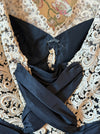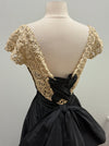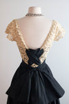 The gown is fashioned from black silk taffeta, its voluminous ballet length skirt sweeping into a dramatic full circle silhouette that evokes the grand glamour of Dior’s New Look. The bodice, a masterpiece of design, features an intricately worked ivory lace overlay delicately accented with rhinestones, lending a soft shimmer under evening light. The lace forms a deep V neckline both front and back, framing the shoulders and décolletage with sculptural femininity. At the waist, panels of black silk are artfully draped and crossed to create a cinched, sculptural midsection that defines the hourglass form. The back reveals a spectacular construction: the black silk bands interlace to form a crisscross motif before extending into a lavish bow and cascading bustle, emphasizing the designer’s eye for theatrical proportion and finish. Zips up the side with original metal zipper. In excellent condition, freshly dry cleaned and ready to wear.