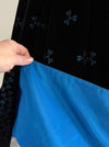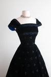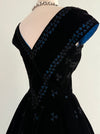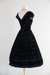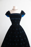Absolutely stunning 1950's inky black velvet cocktail dress with radiant sapphire blue underlay. The elegant fitted bodice features a wide square neckline and petite cap sleeves, both framed with rows of velvet eyelet embroidery backed in sapphire for subtle, mesmerizing dimension. The velvet itself is cut into tiny floral eyelets, each carefully embroidered around the edges so the vivid blue underlayer peeks through like jewels set in velvet. The defined waist gives way to a full, deeply pleated skirt, also backed in vibrant sapphire blue taffeta that shows through both the eyelets and the movement of the skirt. A dramatic V-shaped back adds just the right amount of allure while showcasing the exquisite workmanship. Zips up the side with original metal zipper. In excellent condition, freshly dry cleaned and ready to wear.
