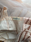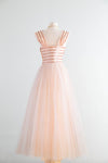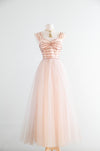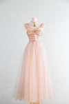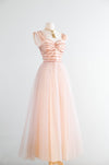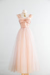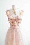 A heavenly dream in blush, this 1950s formal gown by Emma Domb captures the romantic elegance of midcentury eveningwear. The fitted bodice, crafted from soft blush pink nylon tulle layered over taffeta, is beautifully structured with horizontal bands of shimmering rose-gold sequins that highlight the curve of the bust and waist. Wide sequined straps extend over the shoulders, creating a softly sculpted, feminine line.