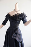 An extraordinary example of mid-century couture from Hattie Carnegie, this 1950s black silk taffeta cocktail dress captures the dramatic sophistication and architectural femininity that defined Carnegie’s atelier in the postwar years.