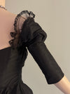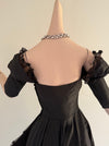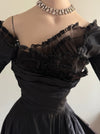 The dress is beautifully constructed with hand-finished couture detailing—a hallmark of Carnegie's work. The off-shoulder neckline is framed by intricate layers of pleated tulle and lace ruffles, creating a play of texture and shadow that flatters the décolletage. The bodice is boned and ruched, sculpting the torso into an elegant hourglass silhouette before sweeping into a voluminous mid-calf skirt that falls in deep, graceful folds.