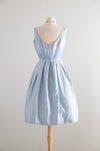 A shimmering example of mid-century elegance, this exquisite Florence Lustig ensemble epitomizes the glamour of early 1960s cocktail dressing. Crafted in a luminous ice-blue silk faille, the set consists of a sleeveless cocktail dress and a coordinating evening coat, both richly embellished with hand-stitched iridescent sequins.