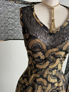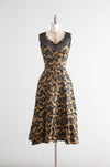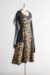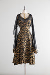 This exquisite late 1940s Chinese evening dress exemplifies the glamour and artistry of postwar fashion, when East–West design influences created strikingly sophisticated silhouettes. The dress is crafted from rich black brocade woven with a metallic gold pattern of stylized blossoms, and bamboo, symbols of longevity and prosperity in Chinese decorative arts. The fitted bodice features a sweetheart neckline with black floral lace, which continues over the shoulders and across the upper back, adding an air of delicacy and allure. The full, mid-length skirt flares gracefully from the waist, designed to move with elegant fluidity. Zips up the side with original metal zipper. Comes complete with matching shawl.