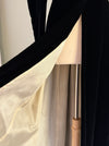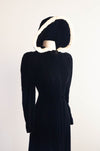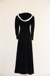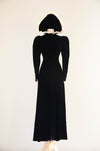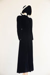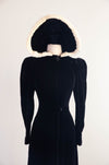 A rare and breathtaking example of 1930s glamour, this floor-length evening coat is fashioned from sumptuous black silk velvet and features a dramatic hood edged in creamy natural ermine. The sweeping silhouette and sculpted shoulders capture the romantic, fairy-tale elegance that defined late-Depression-era evening wear, when Hollywood-inspired opulence offered an escape from austerity.