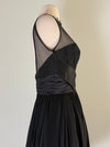 This exquisite piece features a fitted bodice with an illusion neckline, crafted from sheer black chiffon that creates the effect of a strapless sweetheart dress floating beneath a delicate veil. The draped and ruched silk satin waistband cinches the figure, sculpting a narrow midsection before releasing into a full, softly gathered chiffon skirt that moves with ethereal lightness. Ideal for dancing in... The back reveals a dramatic plunging V-line framed in illusion chiffon, balancing allure with restraint.