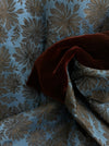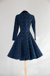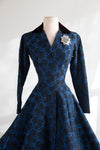 Absolutely darling late 50's Estevez midnight blue and black floral brocade party dress. Featuring an iconic fit and flare silhouette bolstered by a pellon lined full circle skirt. Zips down the front with original metal zipper. The v neckline is accented with a face framing velvet collar in a deep brownish black. Perfect for a holiday party or winter event. In overall excellent condition, freshly dry cleaned and ready to wear.