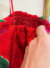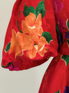 This vibrant 1980s silk party dress by Raul Blanco captures the exuberance and theatrical flair of the decade with its bold silhouette and painterly floral design. Tailored in a rich scarlet silk jacquard woven with a subtle floral motif, the dress is overlaid with a striking print of oversized blossoms in vivid shades of orange, purple, pink, and green, creating a dynamic interplay of texture and color.