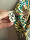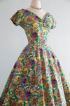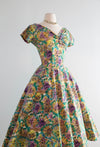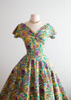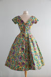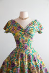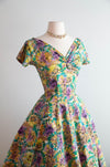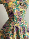Absolutely stunning early 50's cotton floral firework print cotton dress by designer Suzy Perette. This joyful print in shades of yellow, green, pink and purple made of a pellon backed cotton and has interior hip bolsters to maintain the perfect silhouette. Featuring a wasp like waist, v neckline and short sleeves. Can be worn with or without a petticoat if you desire a less full silhouette. Zips up the back with original metal zipper. In excellent condition, freshly dry cleaned and ready to wear.