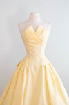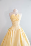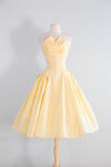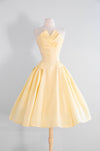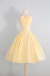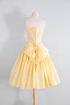 This ethereal 1950’s party dress in soft buttercup yellow taffeta features a strapless fitted bust and a cinched waist, accentuating a graceful fit and flare silhouette. The full skirt with delicate pleated sides adds volume and movement, while a striking oversized bow at the back offers a charming focal point. The interior bodice has boning for support. Looks to have been custom made. In excellent condition, this dress embodies timeless elegance perfect for any special occasion.