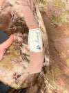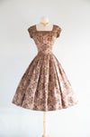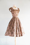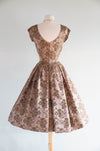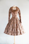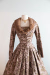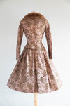 This exquisite 1950’s silk brocade cocktail dress with matching jacket by Original by Rudolf exemplifies the refined, couture-inspired elegance of mid-century American fashion. Crafted from a luminous floral brocade in soft taupe and olive tones, the dress features a beautifully shaped square neckline, a sculpted hourglass bodice, and a full, deeply pleated skirt that creates classic 1950s volume.