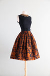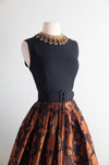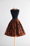 The epitome of glamorous fall fashion! Stunning late 1950's cocktail dress by Kimie. Featuring a fitted black rayon bodice with a thick belt to emphasize the waist above a spectacular full shimmering copper floral print skirt. The perfect dress for a special occasion this fall! Fully lined interior, zips up the back with original zipper. In excellent condition, freshly dry cleaned and ready to wear.