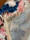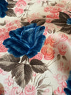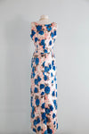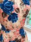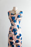 This stunning early 1960s custom couture evening gown features a delicate silk rose print on an ivory background, accented with pink and grey foliage and striking blue velvet roses. The sleeveless design includes a graceful bateau neckline and a ballet-length hem that extends longer in the back for elegant movement. A back zipper ensures a seamless fit, embodying mid-century sophistication with intricate detail and luxurious fabric.